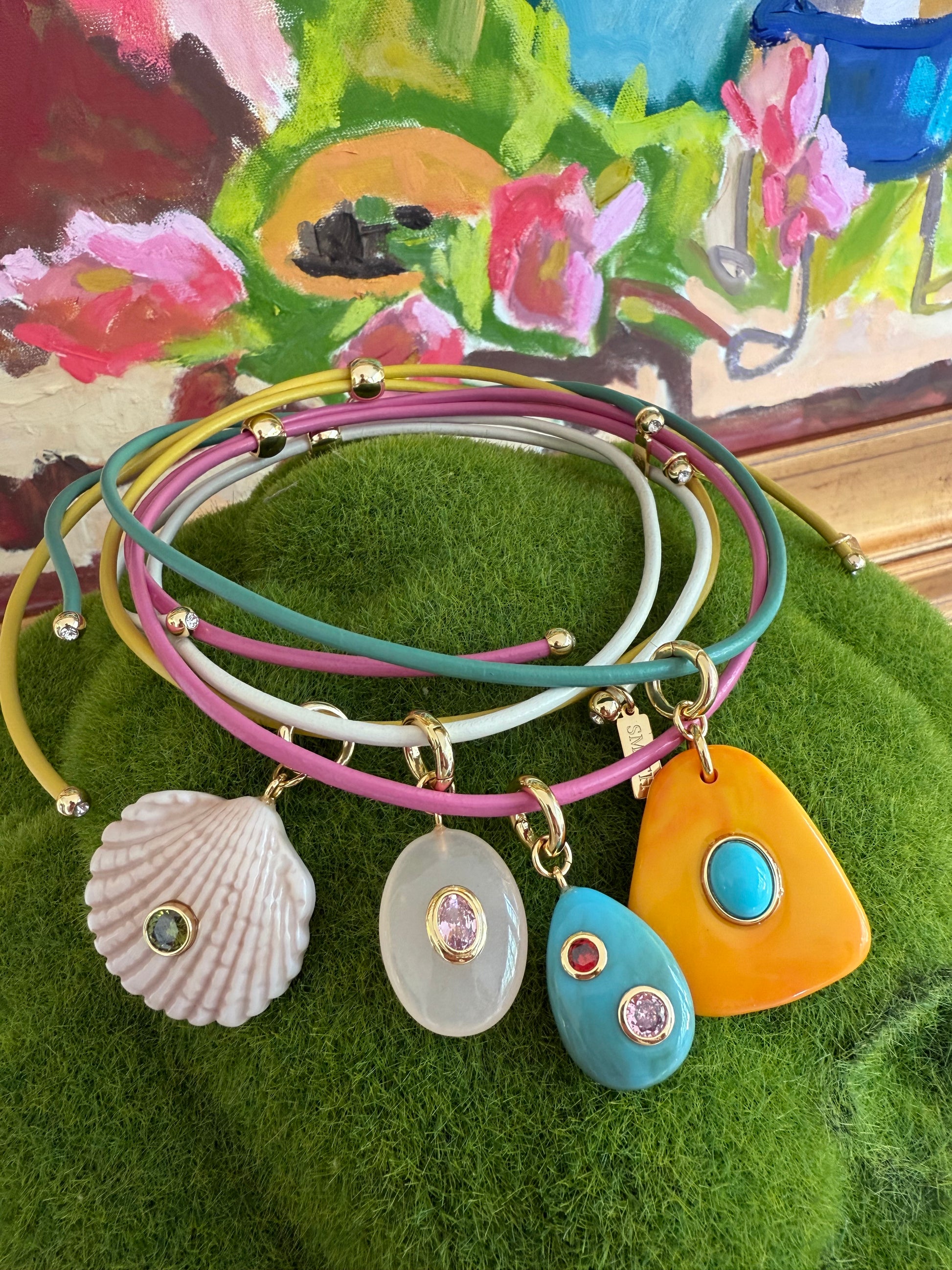 A turquoise teardrop pendant accented with a pink stone, set on an adjustable 26” pink leather cord. An effortless statement that adds color and personality to any look.